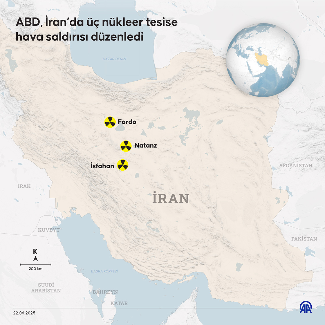 ABD, İran’da üç nükleer tesise hava saldırısı düzenledi. (Grafik: Muhammed Ali Yiğit/AA)