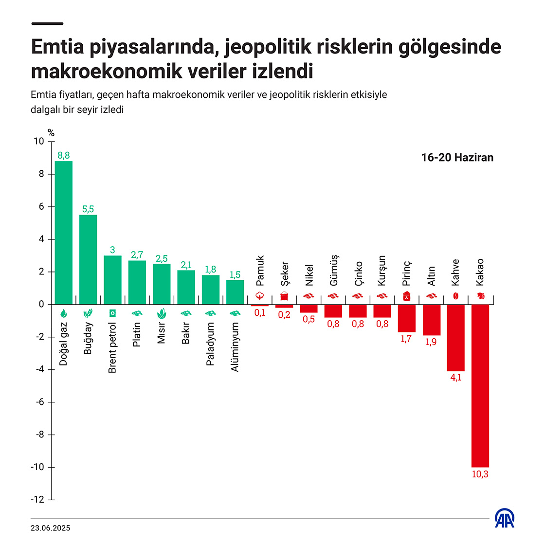 Emtia fiyatları, geçen hafta makroekonomik veriler ve jeopolitik risklerin etkisiyle dalgalı bir seyir izledi. (Grafik: Bedirhan Demirel/AA)