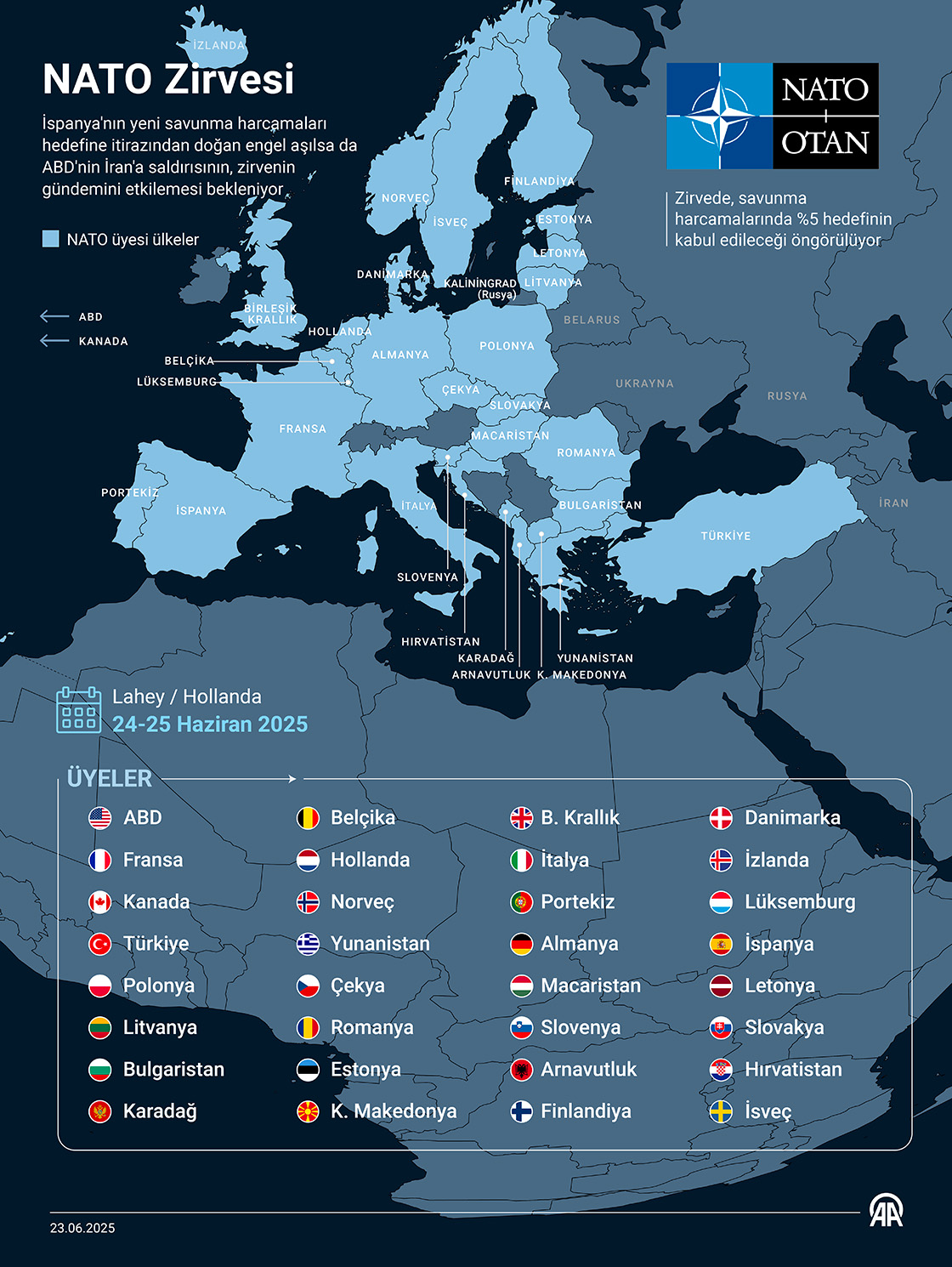 Savunma harcamalarında yüzde 5 hedefinin kabul edilmesi odağında yapılacak NATO Zirvesi, İspanya'dan gelen itirazlar ve ABD'nin İran'a saldırıları nedeniyle gergin atmosferde başlayacak. (Grafik: Elif Acar/AA)