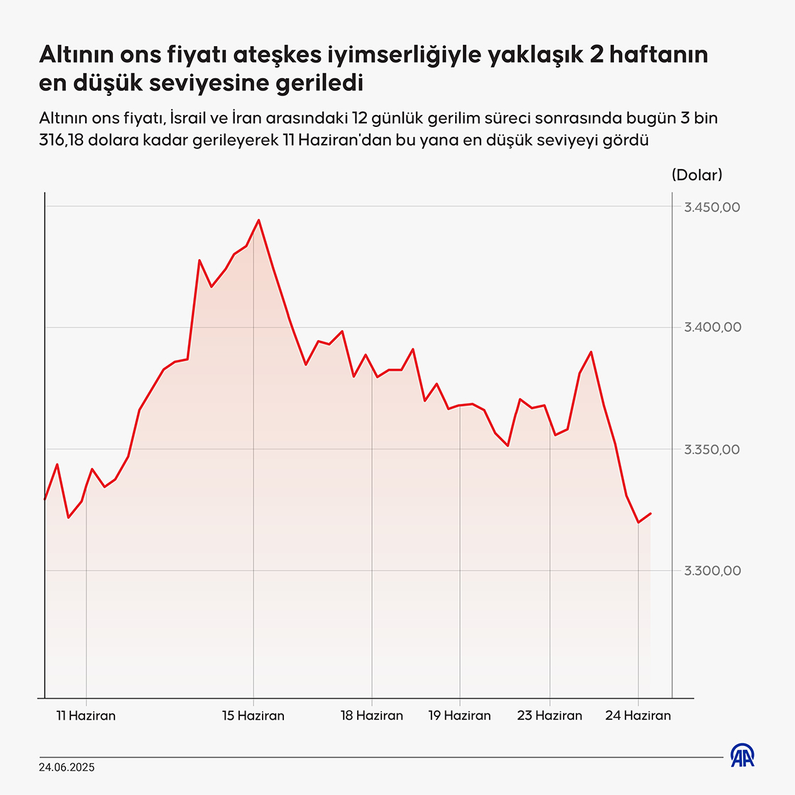 Altının ons fiyatı, İsrail ve İran arasındaki 12 günlük gerilim süreci sonrasında bugün 3 bin 316,18 dolara kadar gerileyerek 11 Haziran'dan bu yana en düşük seviyeyi gördü. (Grafik: Murat Usubali/AA)24 Haziran 2025•Güncelleme: 24 Haziran 2025