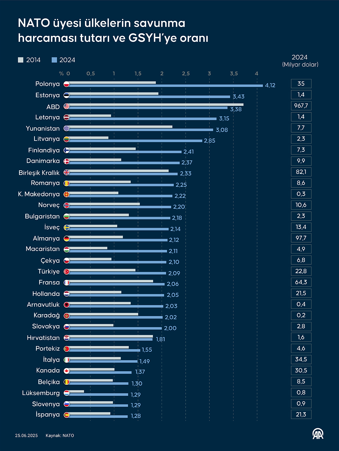 NATO üyesi ülkelerin savunma harcaması tutarı ve GSYH’e oranları. (Grafik: Elif Acar/AA)