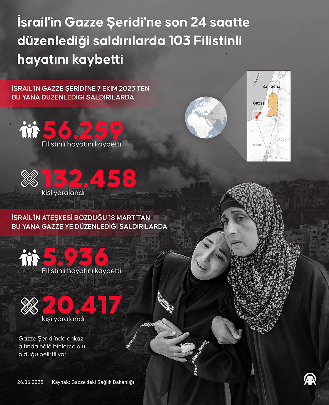 İsrail'in 7 Ekim 2023'ten bu yana Gazze Şeridi'ne düzenlediği saldırılarda hayatını kaybedenlerin sayısı son 24 saatte 103 artarak 56 bin 259'a yükseldi. (Grafik: Bedirhan Demirel/AA)