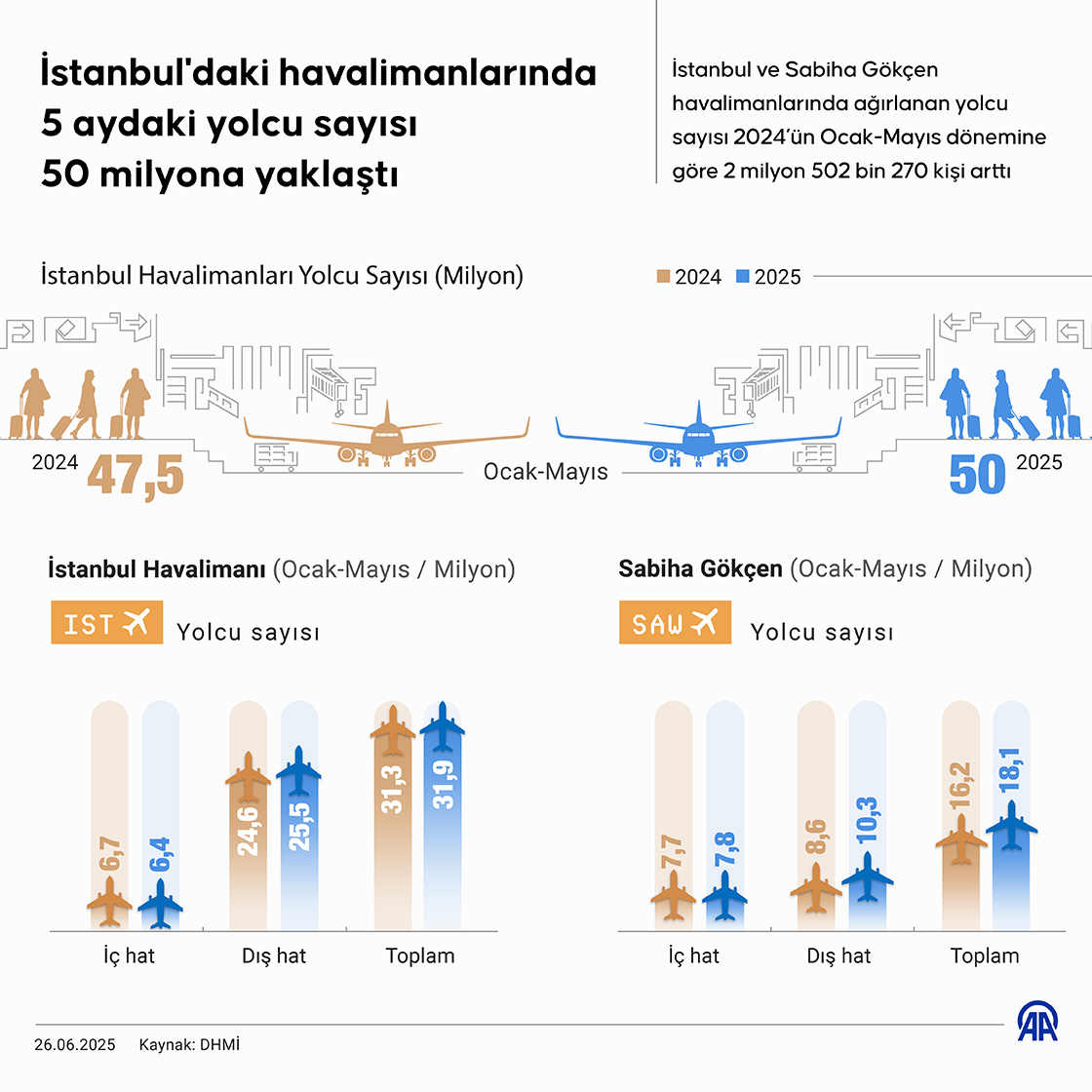 İstanbul'daki havalimanlarında 5 aydaki yolcu sayısı 50 milyona yaklaştı