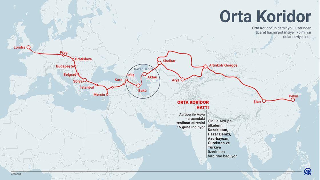 Orta Koridor'un demir yolu üzerinden ticaret hacmi potansiyeli 75 milyar dolar seviyesinde. (Grafik: Bedirhan Demirel/AA)