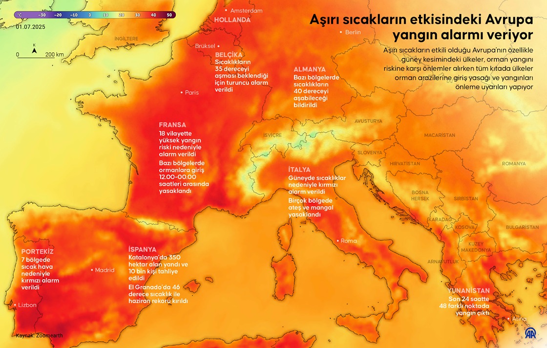 Aşırı sıcakların etkili olduğu Avrupa'nın özellikle güney kesimindeki ülkeler, orman yangını riskine karşı önlemler alırken tüm kıtada orman arazilerine giriş yasağı ve yangınlara karşı uyarılar yapılıyor. (Grafik: Bedirhan Demirel/AA)