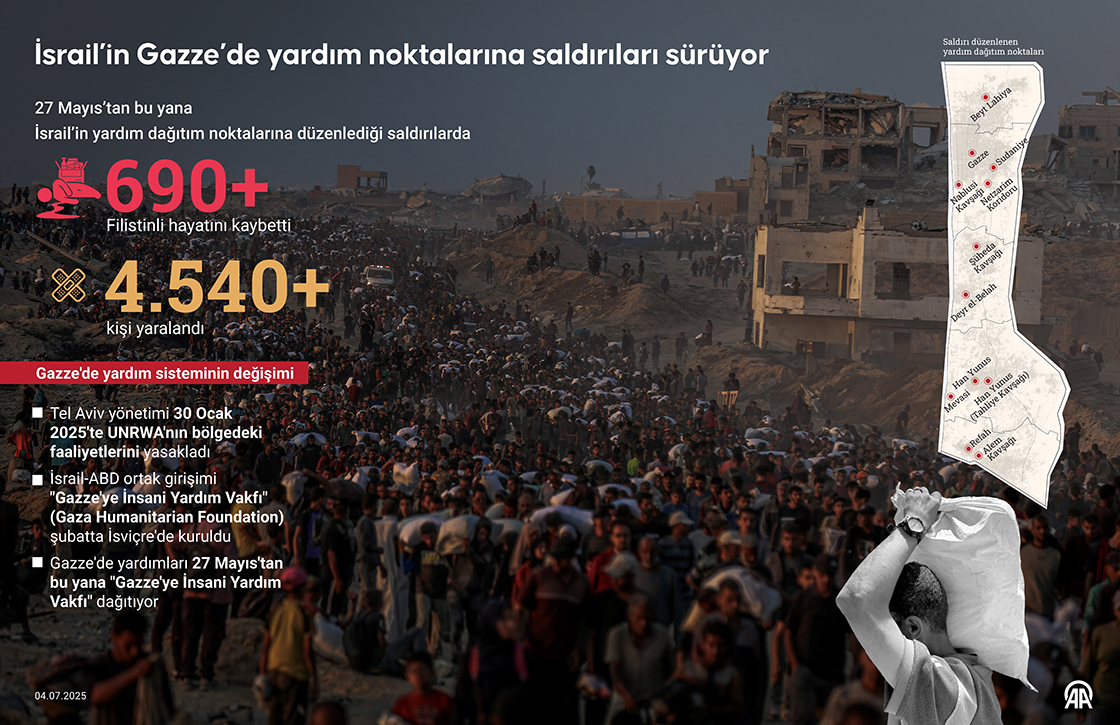 27 Mayıs'tan bu yana İsrail-ABD güdümlü 'Gazze İnsani Yardım Vakfı' tarafından insani yardım adı altında kurulan dağıtım bölgelerinde, İsrail'in Filistinlileri hedef aldığı sistematik saldırılar devam ediyor.