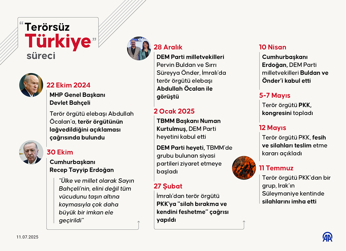 'Terörsüz Türkiye' hedefine ulaşmak için yürütülen çalışmalar, terör örgütü PKK'nın fesih ve silah bırakma kararı almasını sağladı. Grafik: Elif Acar/AA)