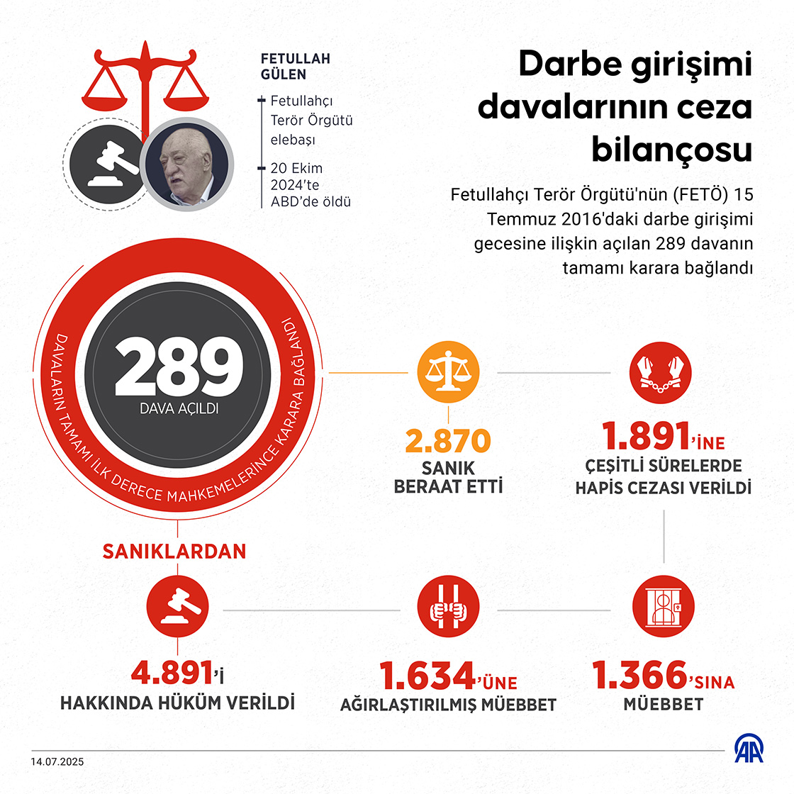 Fetullahçı Terör Örgütü'nün (FETÖ) 15 Temmuz 2016'daki darbe girişimine ilişkin açılan 289 davanın tamamı ilk derece mahkemelerince karara bağlandı. (Grafik: Elif Acar/AA)