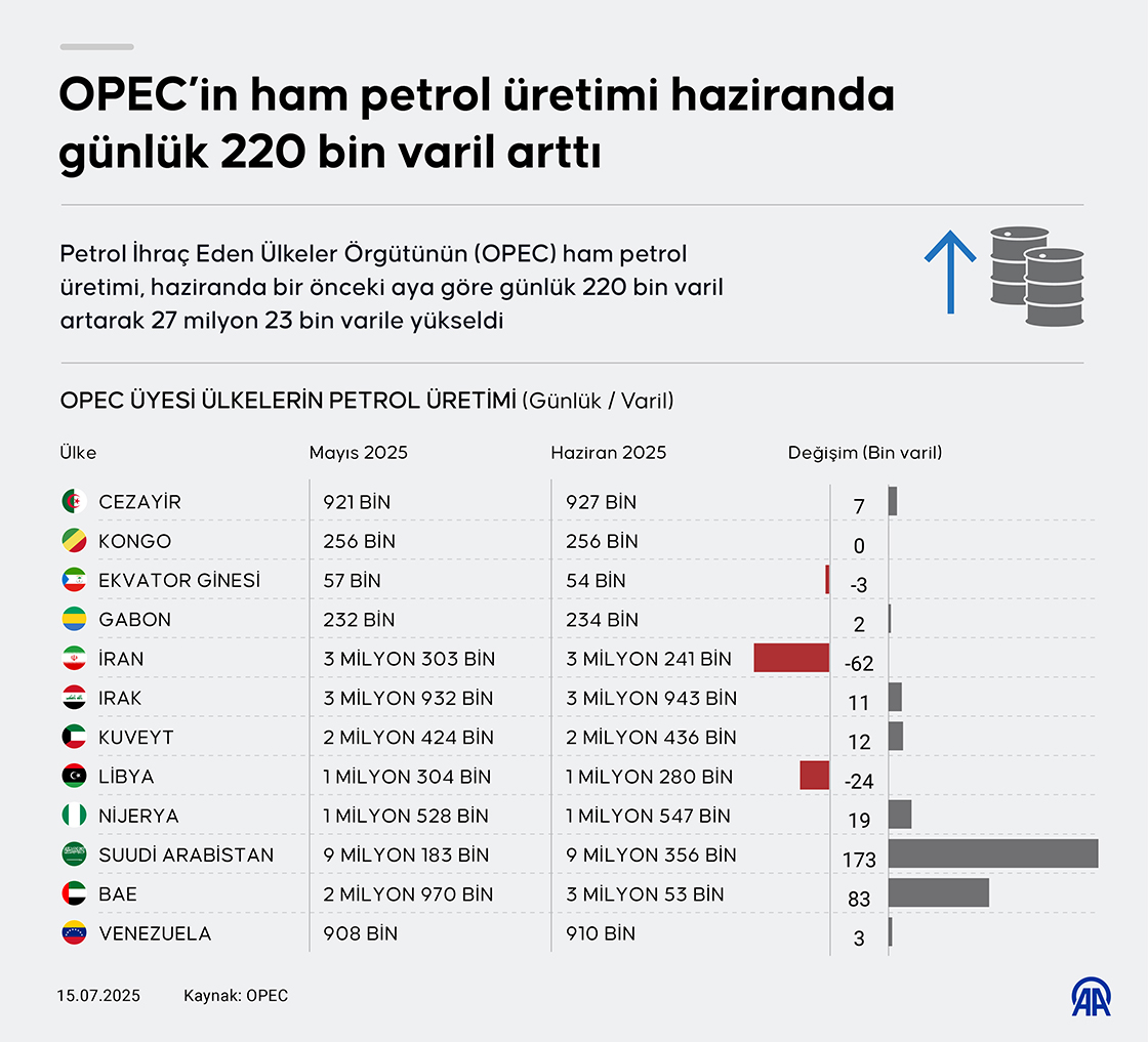 Petrol İhraç Eden Ülkeler Örgütünün (OPEC) ham petrol üretimi, haziranda bir önceki aya göre günlük 220 bin varil artarak 27 milyon 23 bin varile yükseldi. (Grafik: Murat Usubali/AA)