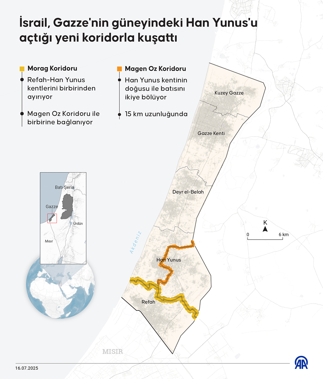 İsrail ordusu, Gazze Şeridi'nin ikinci en büyük kenti Han Yunus'u, açtıkları 'Magen Oz Koridoru' ile kuşattığını duyurdu. (Grafik: Mehmet Yaren Bozğun/AA)