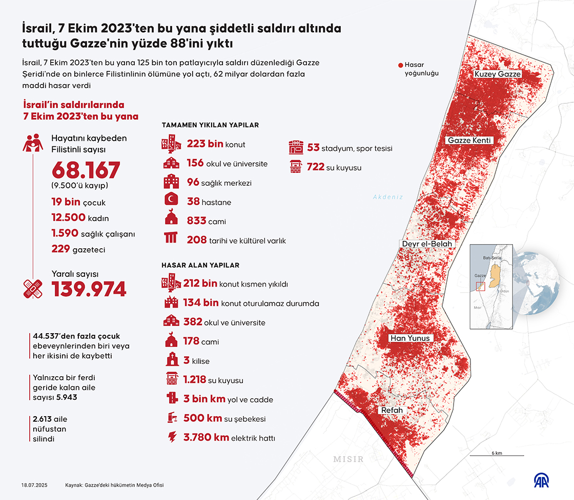 İsrail, 7 Ekim 2023'ten bu yana 125 bin ton patlayıcıyla saldırı düzenlediği Gazze Şeridi'nde on binlerce Filistinlinin ölümüne yol açtı, Gazze'nin yüzde 88'ini yıkıma uğrattı ve 62 milyar dolardan fazla maddi hasar verdi. ( Bedirhan Demirel - Anadolu Ajansı )18 Temmuz 2025•Güncelleme: 18 Temmuz 2025