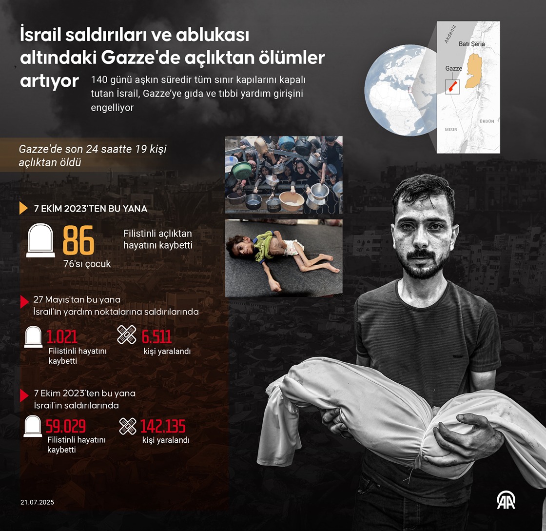 140 günü aşkın süredir tüm sınır kapılarını kapalı tutan İsrail, Gazze’ye gıda ve tıbbi yardım girişini engelliyor. (Grafik: Muhammed Ali Yiğit/AA)