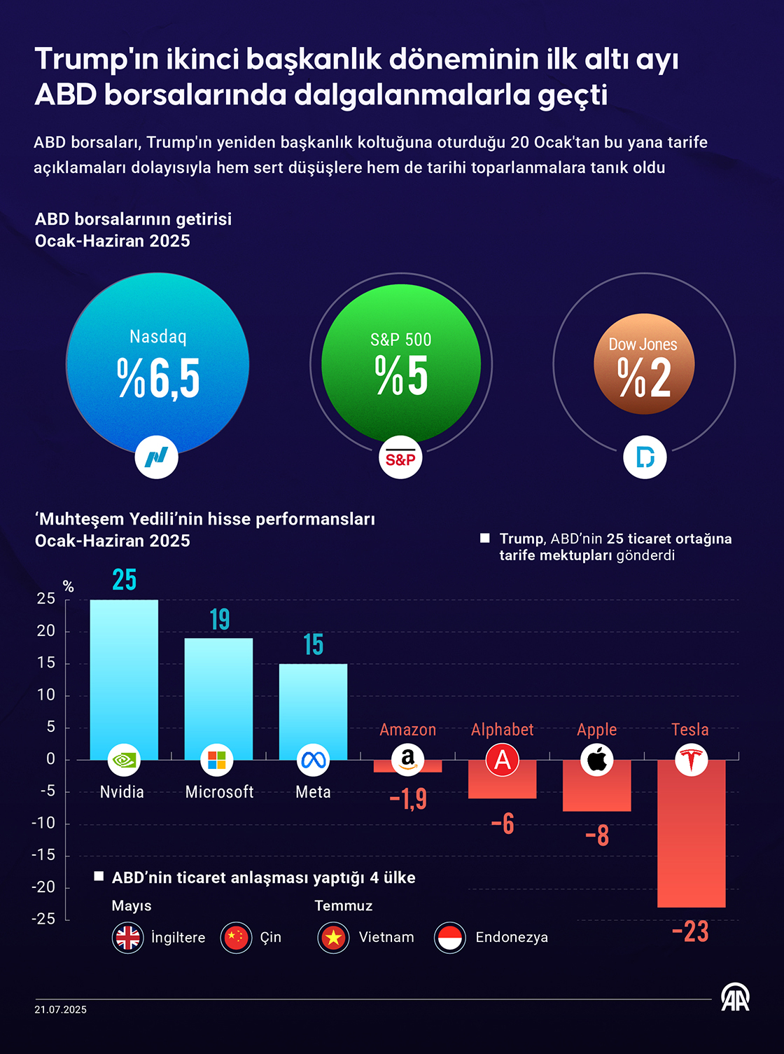ABD Başkanı Donald Trump'ın 20 Ocak'ta başlayan ikinci başkanlık döneminin ilk altı ayı, agresif ticaret politikalarının neden olduğu ekonomik belirsizliklerin etkisiyle ülke borsalarında önemli dalgalanmalarla geçti. (Grafik: Efnan İpşir/AA)21 Temmuz 2025•Güncelleme: 21 Temmuz 2025