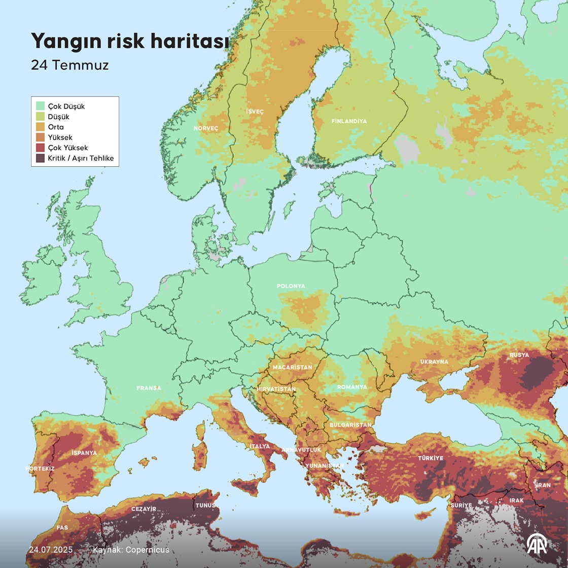 Aşırı sıcakların etkisindeki Türkiye ve Avrupa'nın birçok ülkesinde orman yangınları riski devam ediyor. (Grafik: Yasin Demirci/AA)