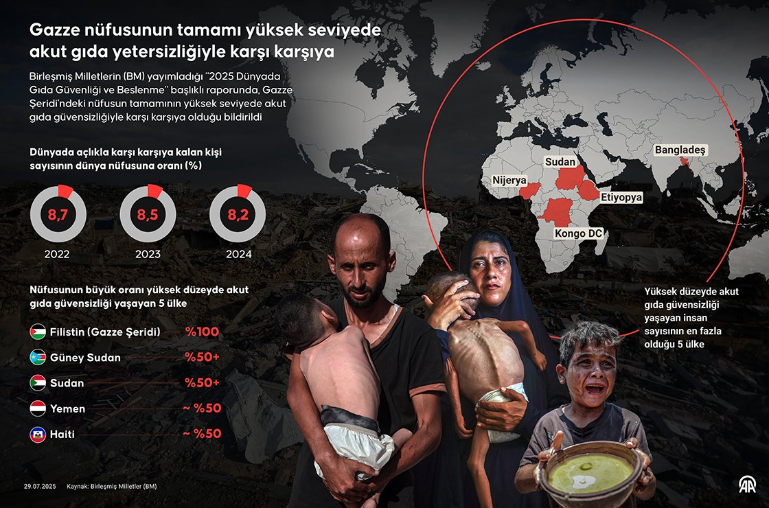 Birleşmiş Milletlerin (BM) yayımladığı '2025 Dünyada Gıda Güvenliği ve Beslenme' başlıklı raporunda, Gazze Şeridi'ndeki nüfusun tamamının yüksek seviyede akut gıda güvensizliğiyle karşı karşıya olduğu bildirildi. (Grafik: Elif Acar/AA)29 Temmuz 2025•Güncelleme: 29 Temmuz 2025