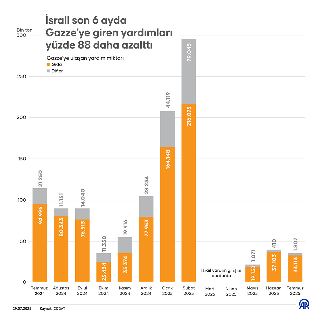 İsrail'in ablukası nedeniyle Gazze Şeridi'ndeki halk açlık ve giderek kötüleşen insani şartlara maruz bırakılırken, temmuzda sınırdan geçişine izin verilen tüm insani yardımlar, şubattaki ateşkes dönemine kıyasla yüzde 88 oranında azaldı. (Grafik: Mehmet Yaren Bozğun/AA)29 Temmuz 2025•Güncelleme: 29 Temmuz 2025