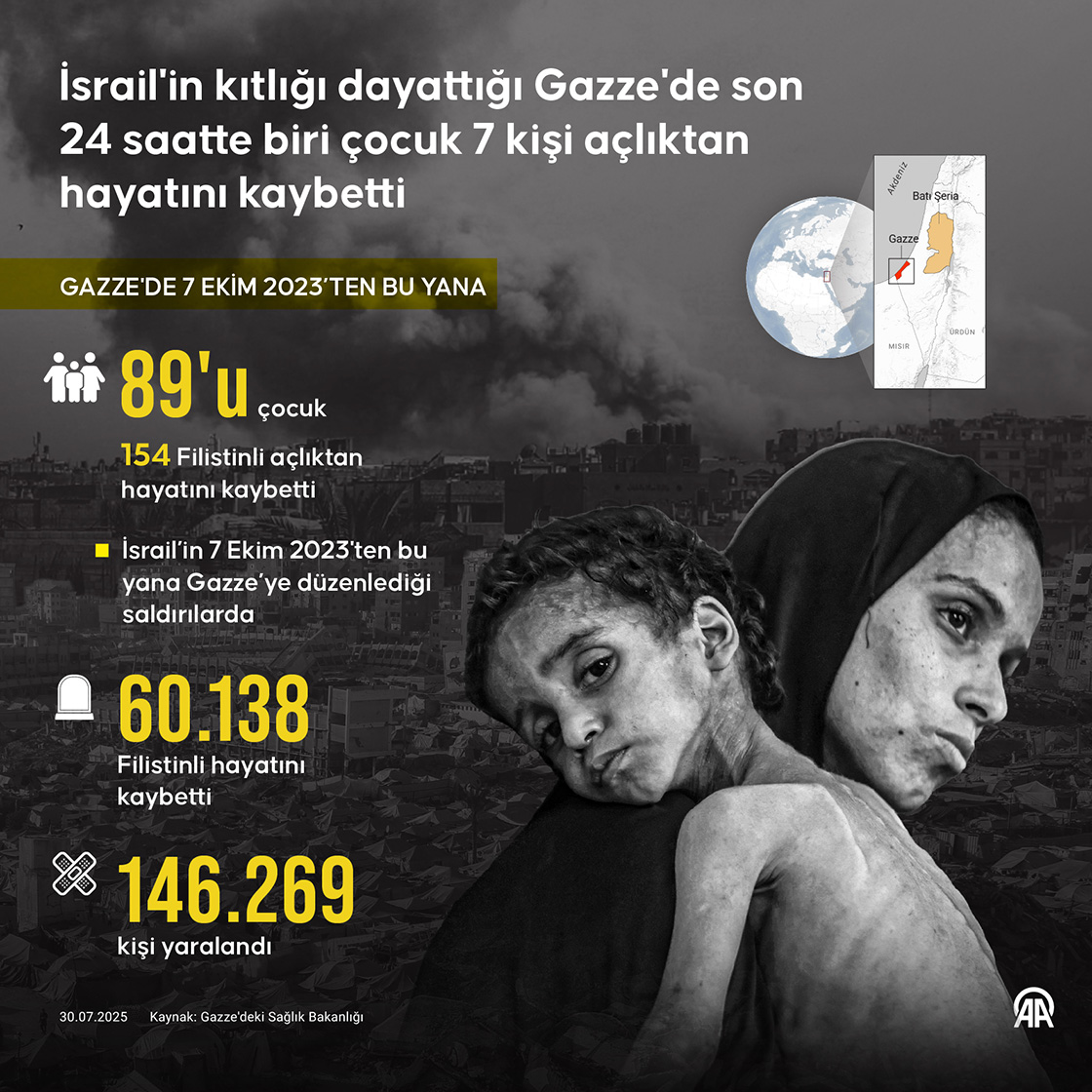 İsrail'in sınır kapılarını kapatıp yardım girişini kısıtlayarak kıtlığa sürüklediği Gazze Şeridi'nde son 24 saatte biri çocuk 7 Filistinlinin daha açlıktan hayatını kaybettiği bildirildi. (Grafik: Efnan İpşir/AA)30 Temmuz 2025•Güncelleme: 30 Temmuz 2025