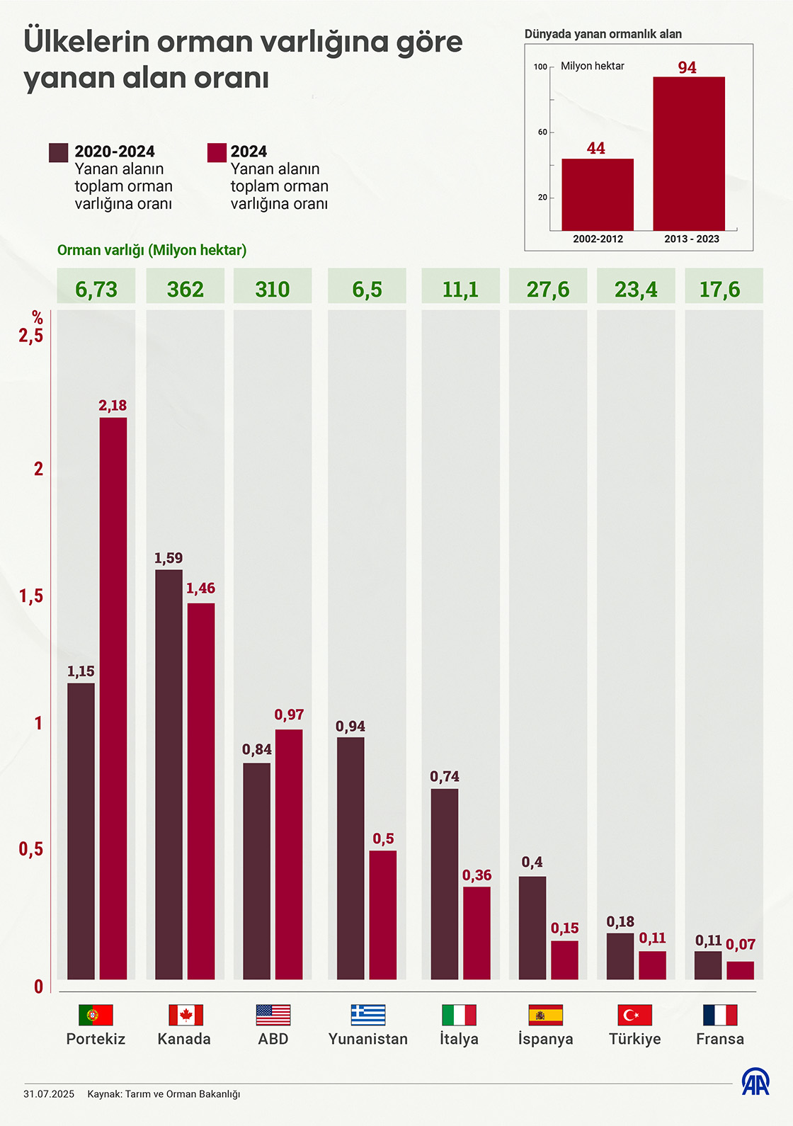 Tarım ve Orman Bakanı İbrahim Yumaklı, Türkiye'nin 23,4 milyon hektar orman alanı olduğuna işaret ederek, '2024'te bunun yüzde 0,11'i yandı. 2020 ile 2024 yılı arasında da bu oran yüzde 0,18. Neden 5 yılı aldığımızda arttı; 2021'deki ve daha sonraki büyük yangınlar sebebiyle. Aynı coğrafyada olduğumuz başka ülkelere bakalım. Fransa hariç ülkelerin tamamından iyi durumdayız.' dedi. (Grafik: Muhammed Ali Yiğit/AA)31 Temmuz 2025•Güncelleme: 31 Temmuz 2025