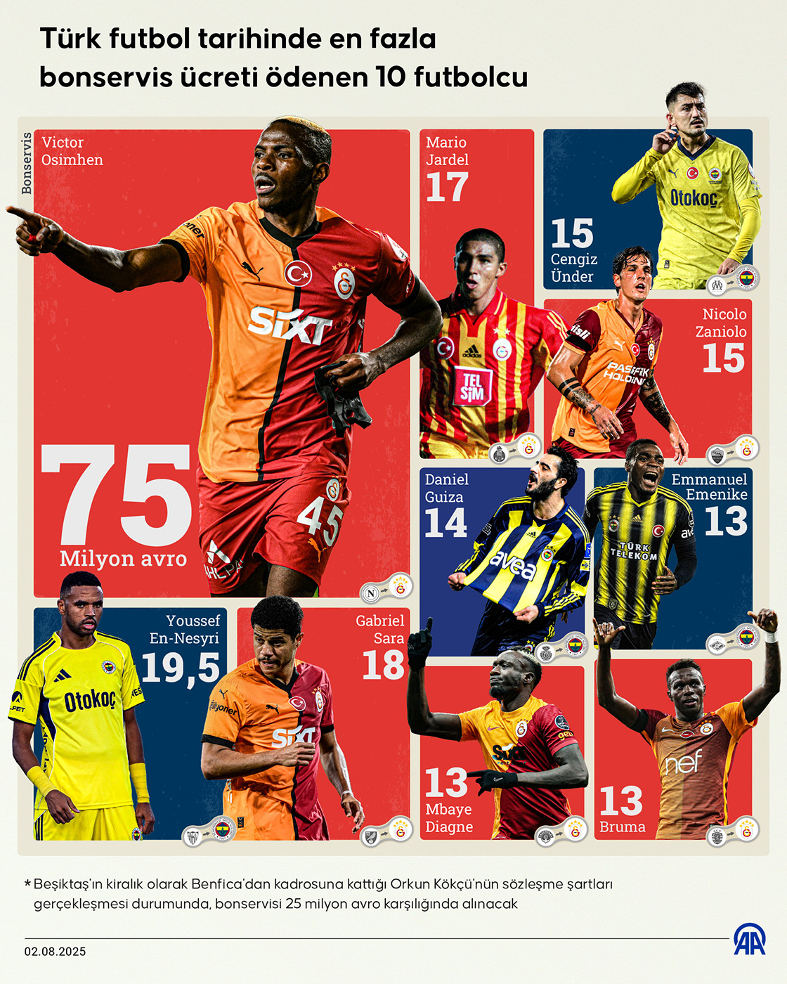 Galatasaray, Nijeryalı golcü Victor Osimhen'i 75 milyon avro bonservis ücretiyle kadrosuna katarak rekor kırdı. (Grafik: Ufuk Celal Güzel/AA)