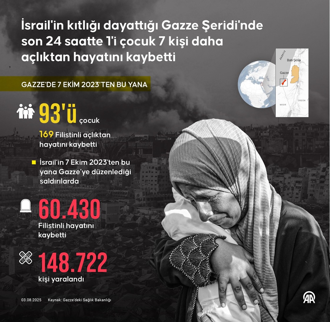 İsrail ordusunun 7 Ekim 2023'ten bu yana Gazze Şeridi'ne düzenlediği saldırılarda hayatını kaybedenlerin sayısı son 24 saatte 98 artarak 60 bin 430'a ulaştı. (Grafik: Efnan İpşir/AA)
