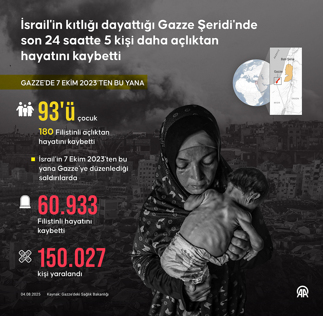 İsrail'in kıtlığı dayattığı Gazze Şeridi'nde son 24 saatte 5 Filistinlinin daha açlıktan hayatını kaybettiği, açlık nedeniyle yaşamını yitirenlerin sayısının 93'ü çocuk olmak üzere 180'e çıktığı bildirildi. (Grafik: Omar Zaghloul/AA)04 Ağustos 2025•Güncelleme: 04 Ağustos 2025