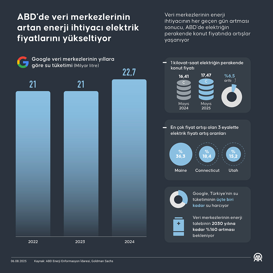 Veri merkezlerinin enerji ihtiyacının her geçen gün artması sonucu, ABD'de elektriğin perakende konut fiyatında artışlar yaşanıyor. (Grafik: Elif Acar/AA)