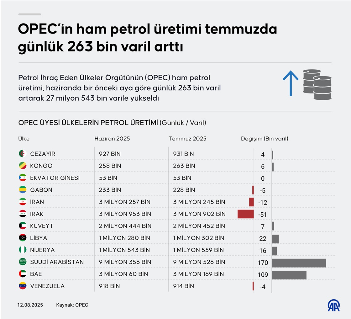 OPEC'in ham petrol üretimi temmuzda günlük 263 bin varil arttı