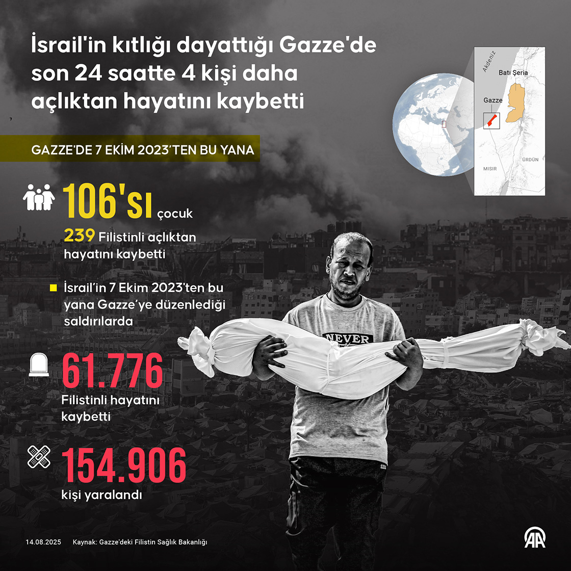 İsrail'in saldırıları ve ablukası nedeniyle kıtlık yaşanan Gazze Şeridi'nde son 24 saatte 4 Filistinlinin daha açlıktan yaşamını yitirdiği, açlık nedeniyle ölenlerin sayısının 239’a çıktığı bildirildi. (Grafik: Ufuk Celal Güzel/AA)14 Ağustos 2025•Güncelleme: 14 Ağustos 2025