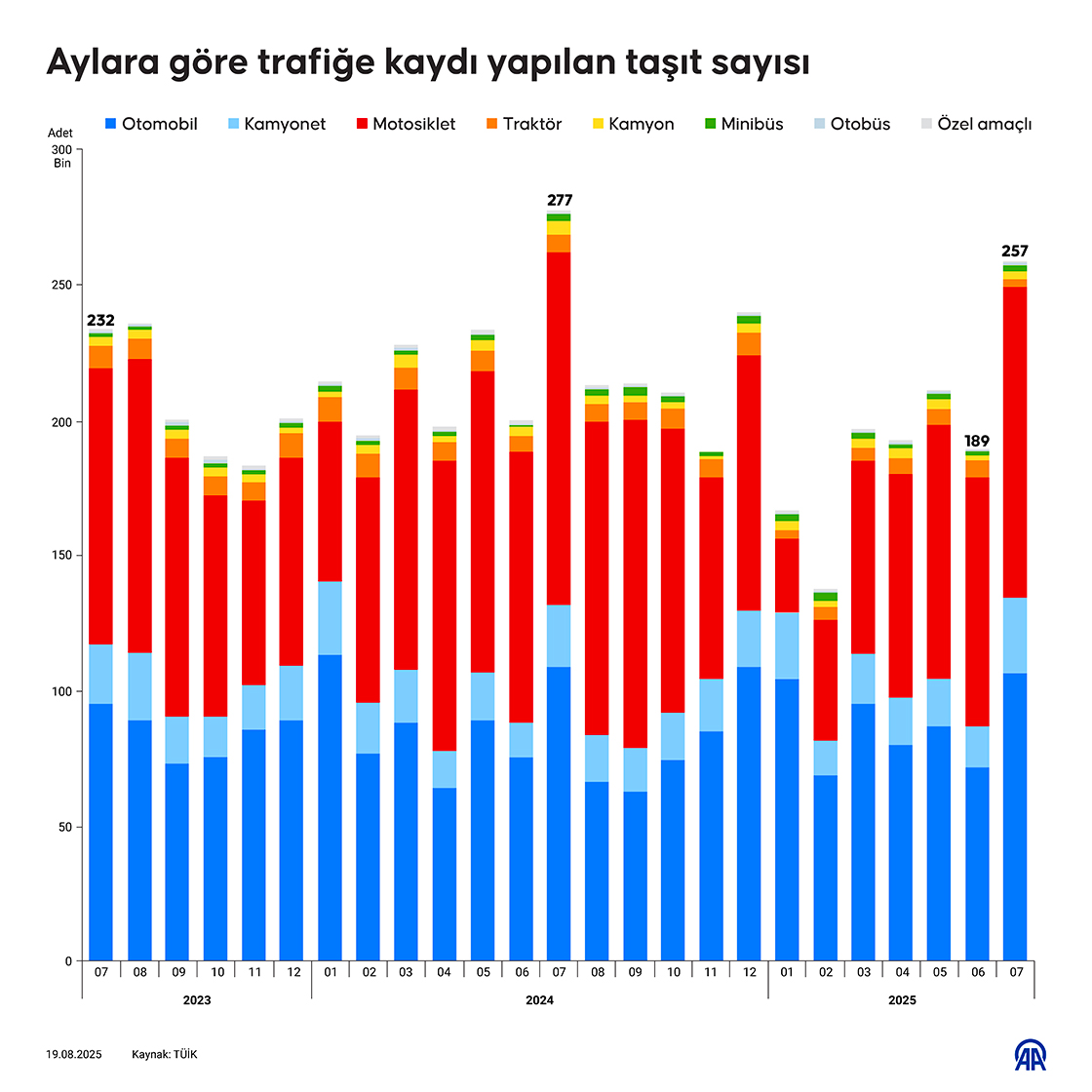 Trafiğe temmuzda 257 bin 471 aracın kaydı yapılırken 5 bin 358 aracın kaydı silindi, böylece trafikteki toplam araç sayısı 252 bin 113 arttı. (Grafik: Elif Acar/AA)