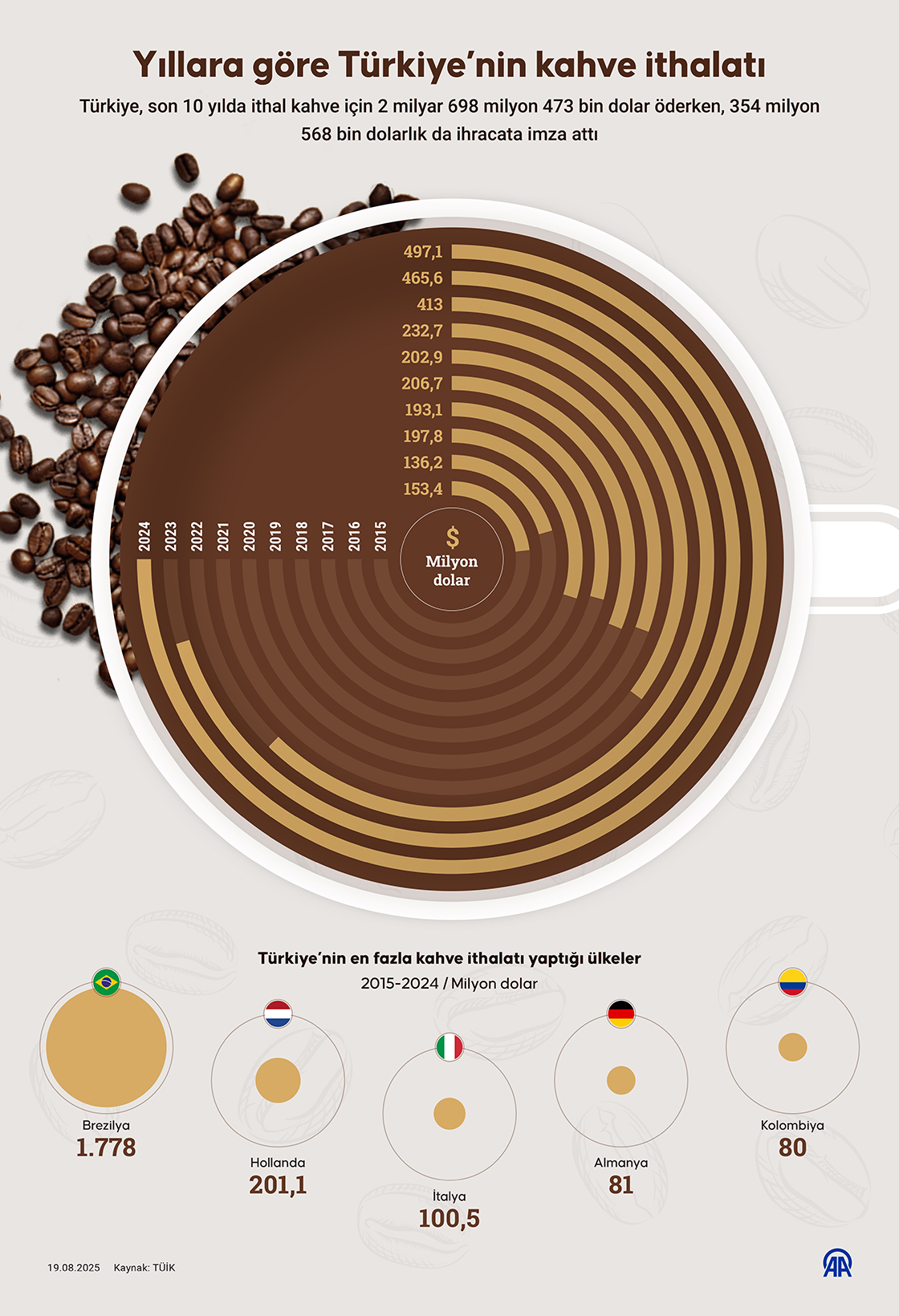 Türkiye, son 10 yılda ithal kahve için 2 milyar 698 milyon 473 bin dolar öderken, 354 milyon 568 bin dolarlık da ihracata imza attı. (Grafik: Muhammed Ali Yiğit/AA)