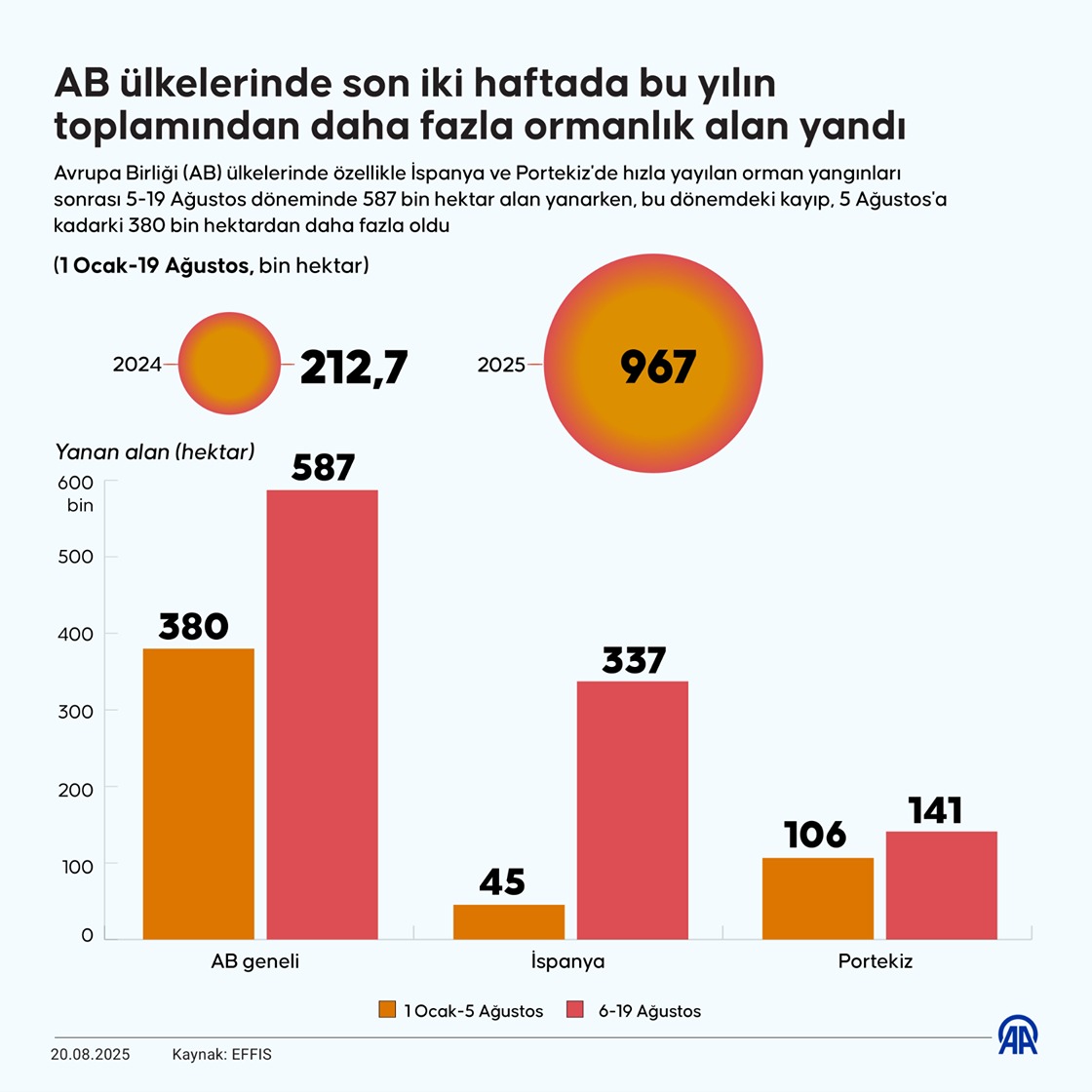 Avrupa Birliği (AB) ülkelerinde özellikle İspanya ve Portekiz'de hızla yayılan orman yangınları sonrası 5-19 Ağustos döneminde 587 bin hektar alan yanarken, bu dönemdeki kayıp, 5 Ağustos'a kadarki 380 bin hektardan daha fazla oldu ( Omar Zaghloul - Anadolu Ajansı )20 Ağustos 2025•Güncelleme: 20 Ağustos 2025