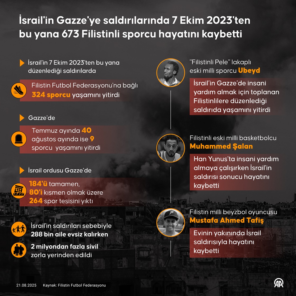 İsrail'in Gazze Şeridi'nde 7 Ekim 2023'ten bu yana sürdürdüğü soykırım ve sistematik saldırılarda bugüne kadar 673 sporcu hayatını kaybetti. (Grafik: Elif Acar/AA)