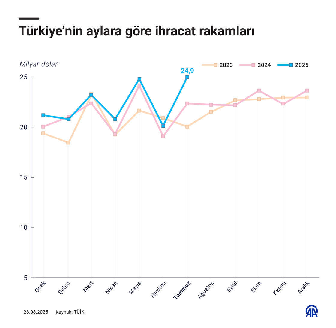 Türkiye'nin ihracatı, temmuzda geçen yılın aynı ayına göre yüzde 11 artarak 24 milyar 938 milyon dolara, ithalatı yüzde 5,4 artışla 31 milyar 383 milyon dolara yükseldi. (Grafik: Efnan İpşir/AA)