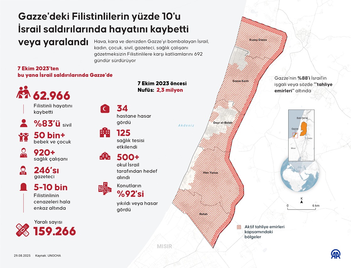 Hava, kara ve denizden Gazze'yi bombalayan İsrail, kadın, çocuk, sivil, gazeteci, sağlık çalışanı gözetmeksizin Filistinlilere karşı katliamlarını 692 gündür sürdürüyor. (Grafik: Efnan İpşir/AA)29 Ağustos 2025•Güncelleme: 29 Ağustos 2025
