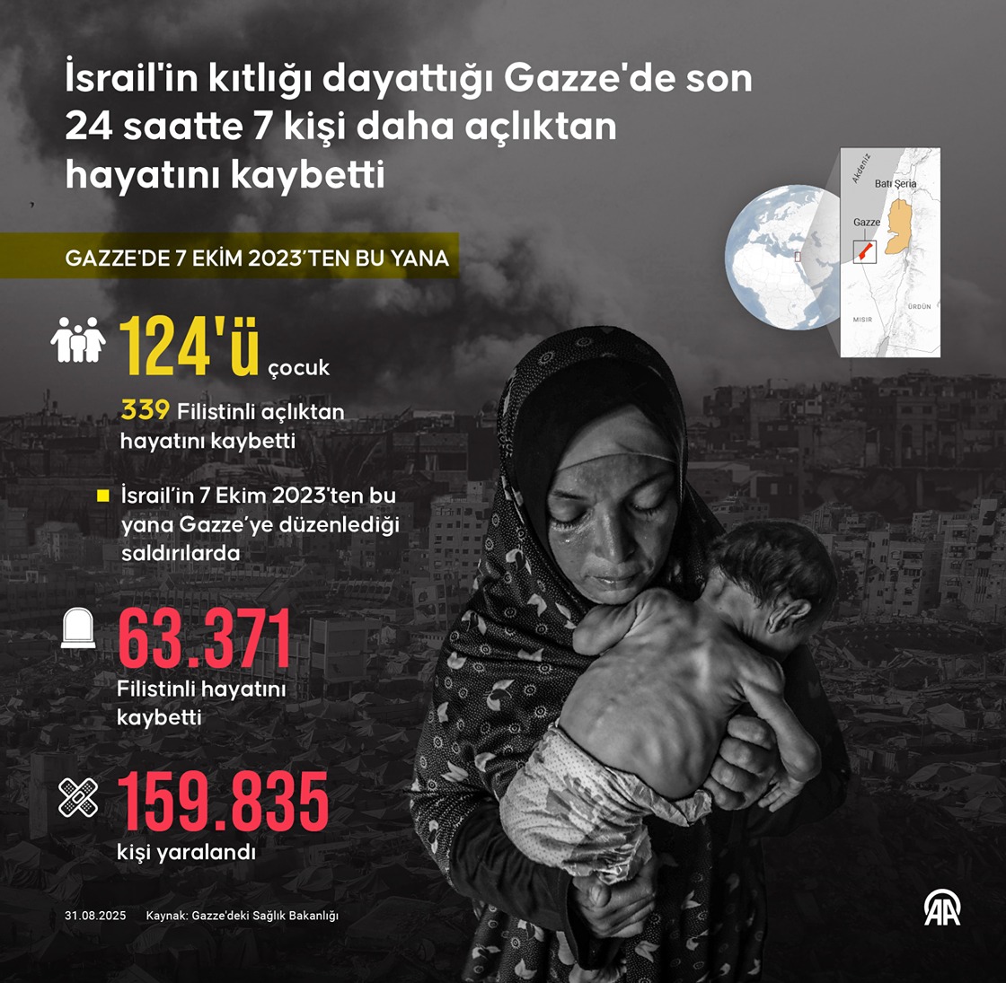 Gazze'de 7 Ekim 2023'ten beri açlık ve yetersiz beslenme nedeniyle yaşamını yitirenlerin sayısı 124'ü çocuk olmak üzere 339'a yükseldi. (Grafik: Kemal Delikmen/AA)