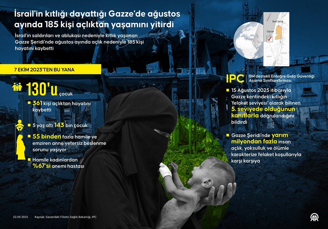 İsrail'in saldırıları ve ablukası nedeniyle kıtlık yaşanan Gazze Şeridi'nde ağustos ayında açlık nedeniyle 185 kişi hayatını kaybetti. (Grafik: Omar Zaghloul/AA)