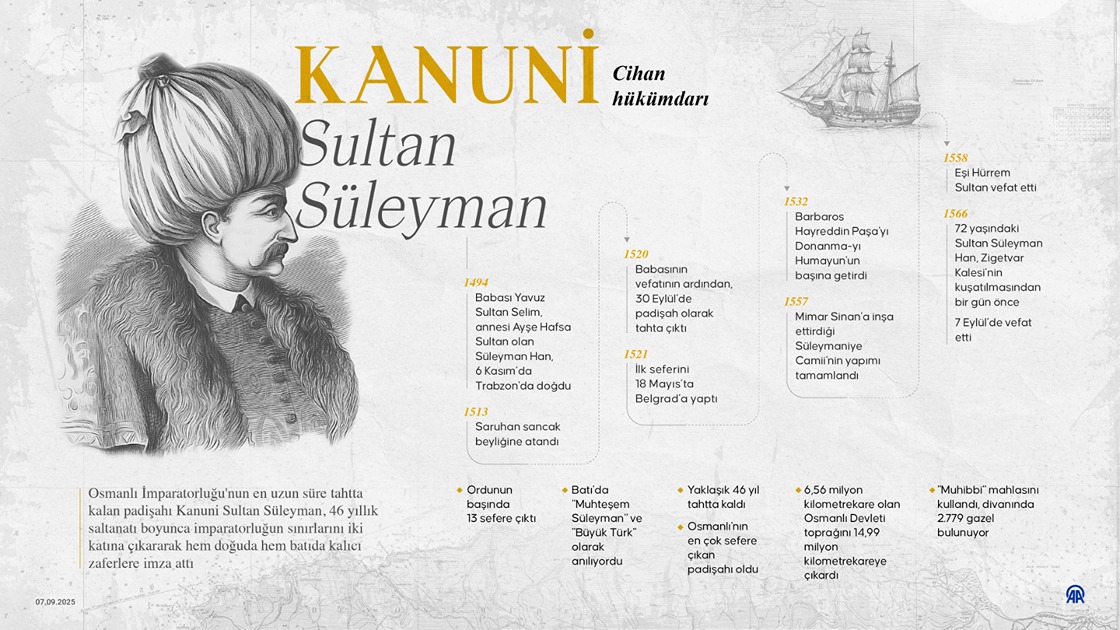Osmanlı İmparatorluğu'nun en uzun süre tahtta kalan padişahı Kanuni Sultan Süleyman, 46 yıllık saltanatı boyunca imparatorluğun sınırlarını iki katına çıkararak hem doğuda hem batıda kalıcı zaferlere imza attı.