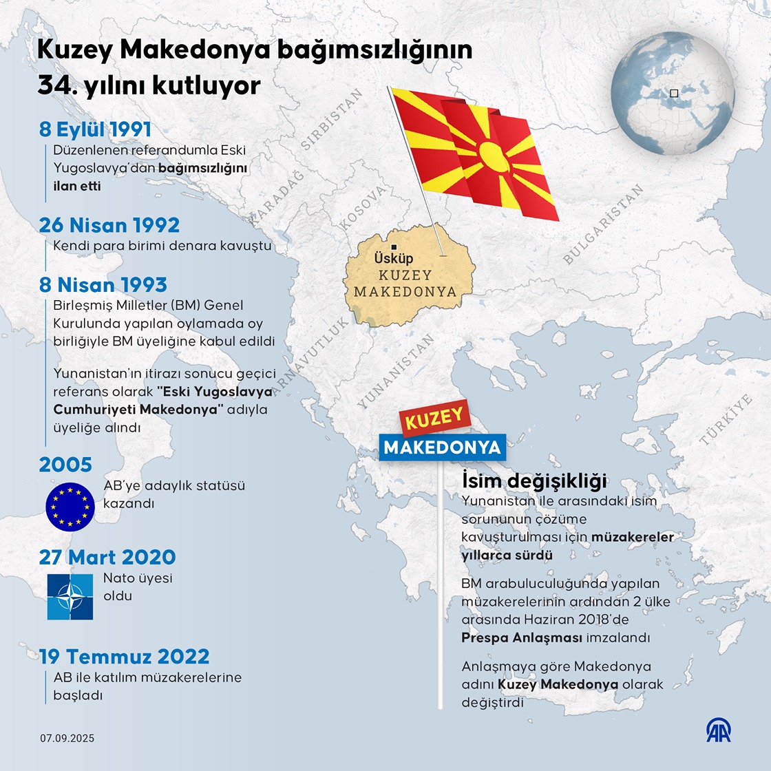 Eski Yugoslavya'dan ayrılan Balkan ülkelerinden Kuzey Makedonya, bağımsızlığının 34. yıl dönümünü kutluyor. (Grafik: Bedirhan Demirel/AA)