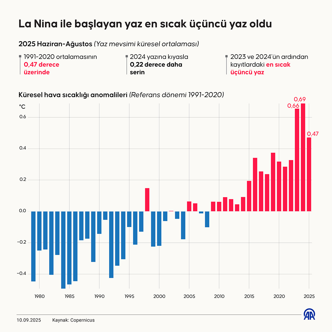 Boğaziçi Üniversitesi İklim Değişikliği ve Politikaları Uygulama ve Araştırma Merkezi Müdürü Prof. Dr. Levent Kurnaz, yaz aylarının başında La Nina'nın etkili olduğunu belirterek, 'Arka planda ise sürekli artan bir küresel ısınma etkisi var. Dolayısıyla La Nina ve El Nino olmasaydı bile 2025 Haziran-Ağustos dönemi dünyada yine en sıcak üçüncü yaz olurdu.' dedi. (Grafik: Murat Usubali/AA)