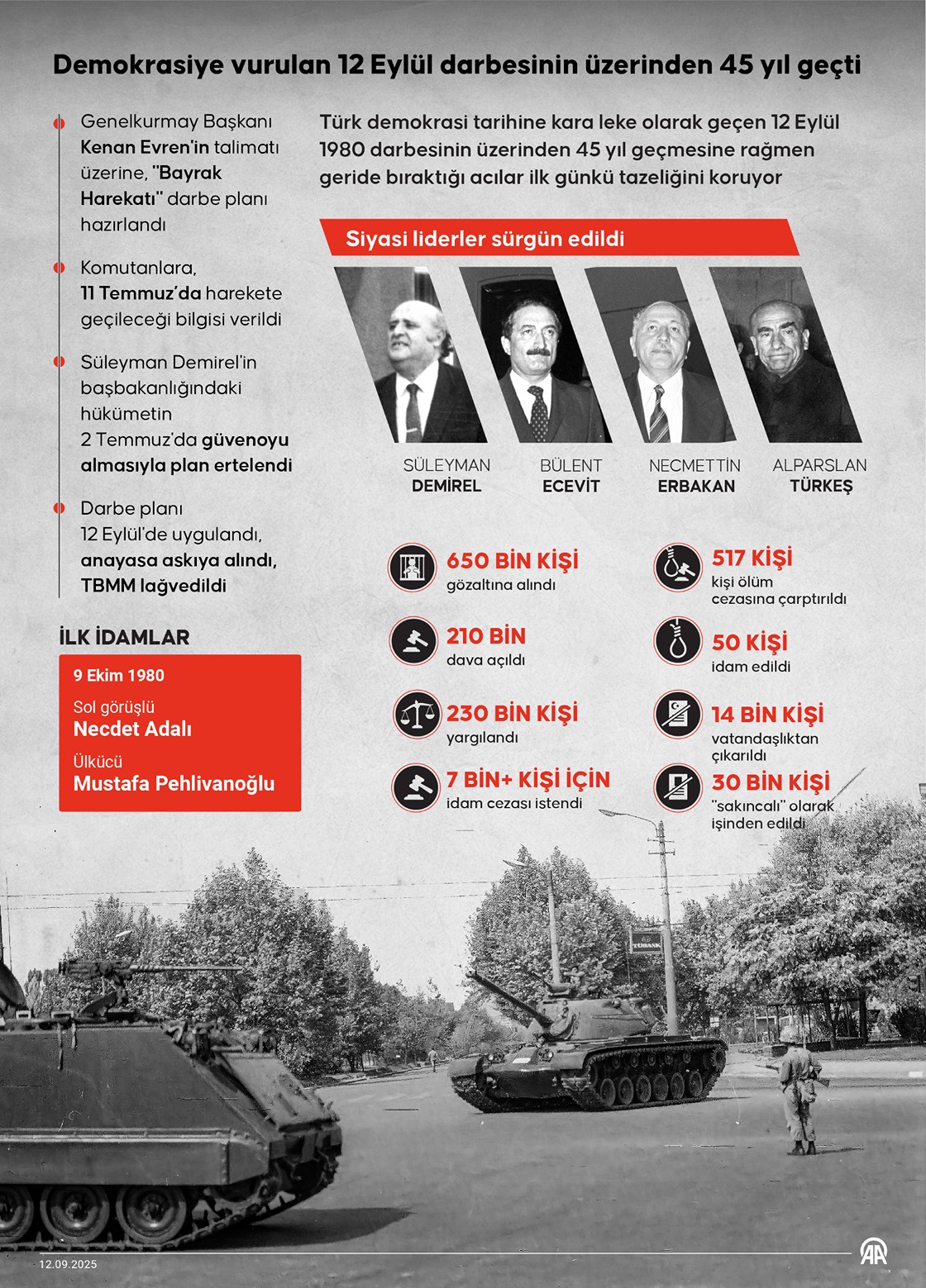Türk demokrasi tarihine kara leke olarak geçen 12 Eylül 1980 darbesinin üzerinden 45 yıl geçmesine rağmen geride bıraktığı acılar ilk günkü tazeliğini koruyor. (Grafik: Murat Usubali/AA)
