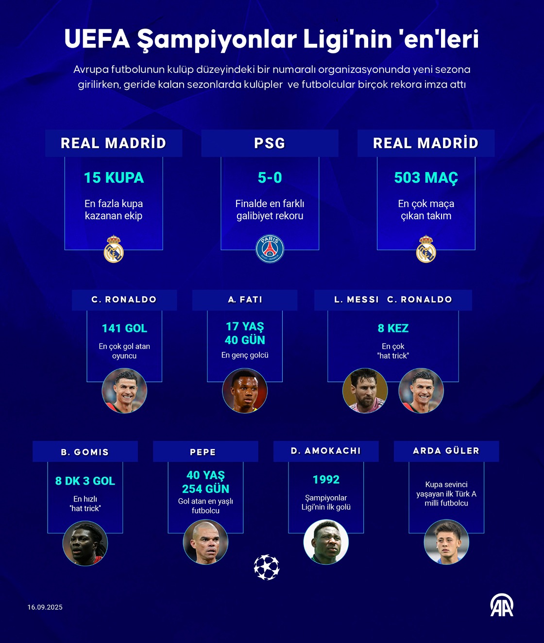 Avrupa futbolunun kulüp düzeyindeki bir numaralı organizasyonunda yeni sezona girilirken, geride kalan sezonlarda kulüpler ve futbolcular birçok rekora imza attı. (Grafik: Efnan İpşir/AA)
