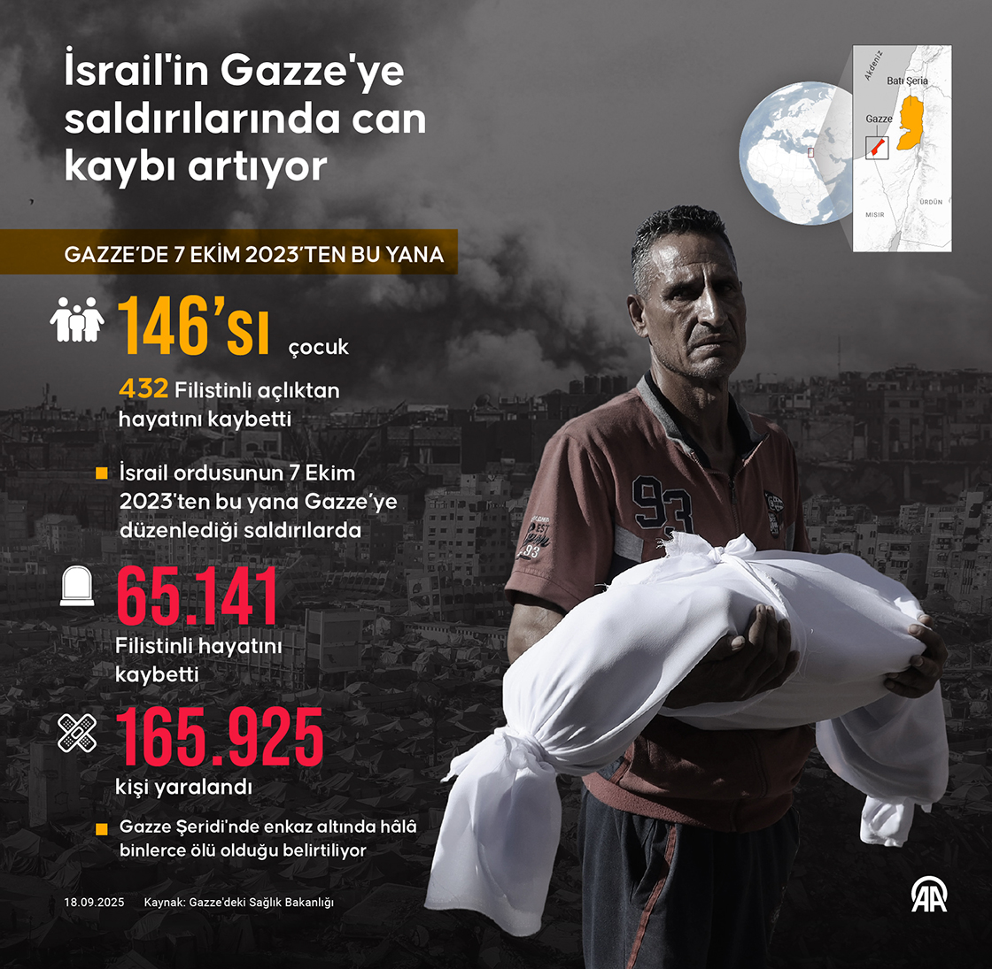 İsrail ordusunun 7 Ekim 2023'ten bu yana Gazze Şeridi'ne düzenlediği saldırılarda yaşamını yitirenlerin sayısı son 24 saatte 79 artarak 65 bin 141’e yükseldi. (Grafik: Bedirhan Demirel/AA)
