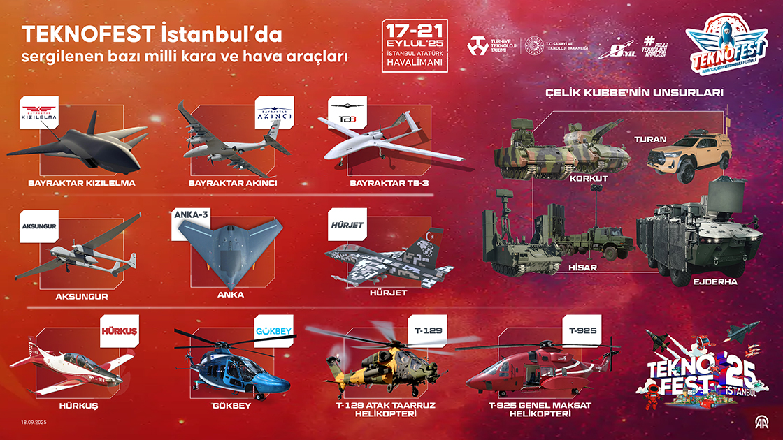 İstanbul Atatürk Havalimanı’nda devam eden TEKNOFEST’te, hava gösterileri, konserler, sahne gösterileri, eğitici atölyeler, simülasyon deneyim alanları, planetaryum, bilim şovları, TEKNOFEST Zaman Tüneli, milli deniz, kara ve hava araçları sergisinin yanı sıra öğrencilere özel ilk uçuş deneyim fırsatı sunuluyor. (Grafik: Ufuk Celal Güzel/AA)18 Eylül 2025•Güncelleme: 18 Eylül 2025