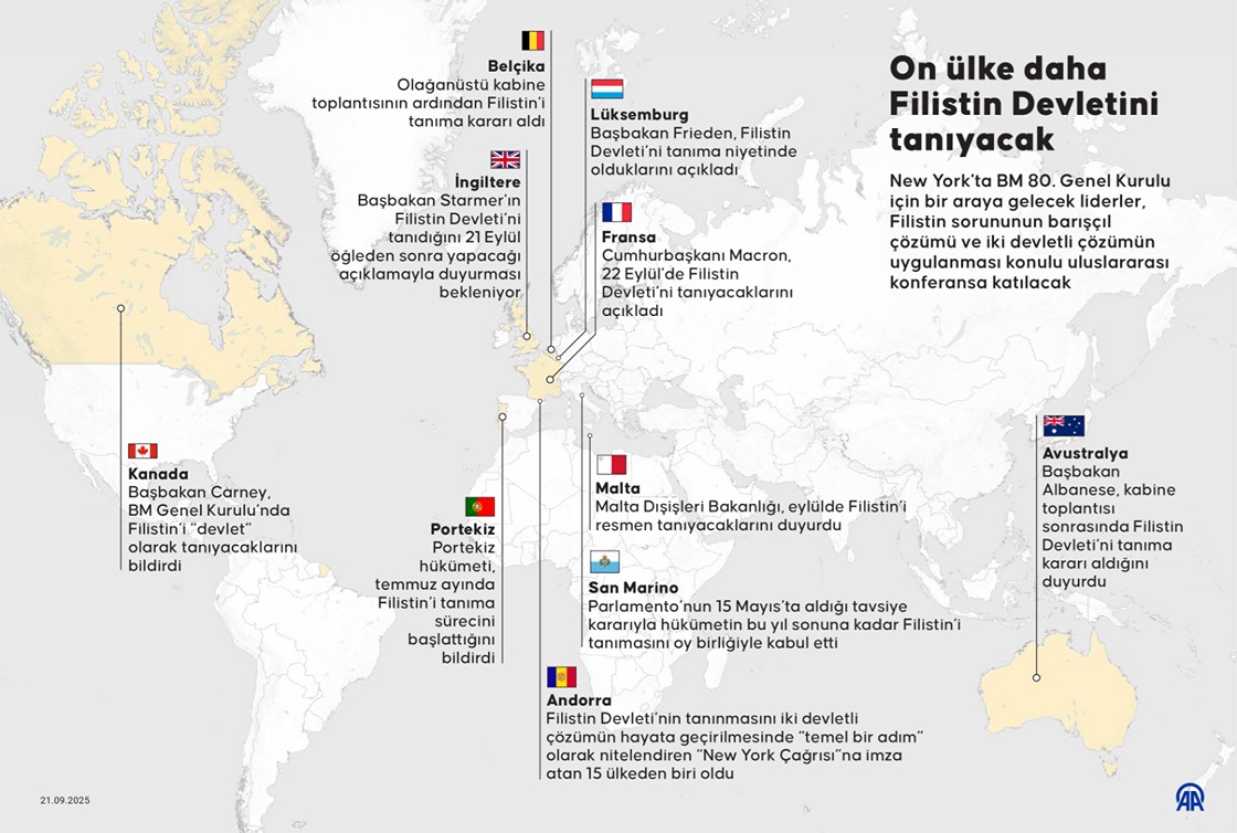 Fransa, İngiltere, Kanada, Avustralya, Belçika, Lüksemburg, Malta, Portekiz, Andorra ve San Marino, New York'ta yapılacak Birleşmiş Milletler (BM) 80. Genel Kurulunda Filistin Devletini tanıdıklarını duyurmaya hazırlanıyor. (Grafik: Yasin Demirci/AA)21 Eylül 2025•Güncelleme: 21 Eylül 2025