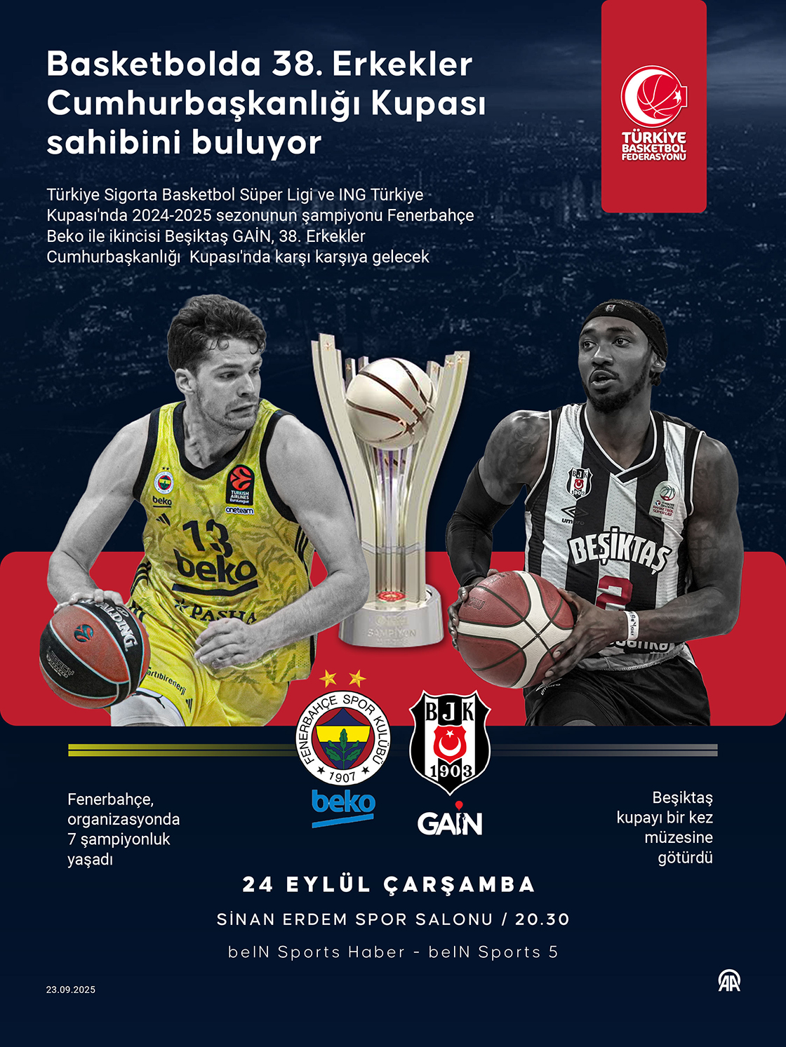 Türkiye Sigorta Basketbol Süper Ligi ve ING Türkiye Kupası'nda 2024-2025 sezonunun şampiyonu Fenerbahçe Beko ile her iki organizasyonun ikincisi Beşiktaş GAİN, 38. Erkekler Cumhurbaşkanlığı Kupası'nda karşı karşıya gelecek. (Grafik: Efnan İpşir/AA)23 Eylül 2025•Güncelleme: 23 Eylül 2025