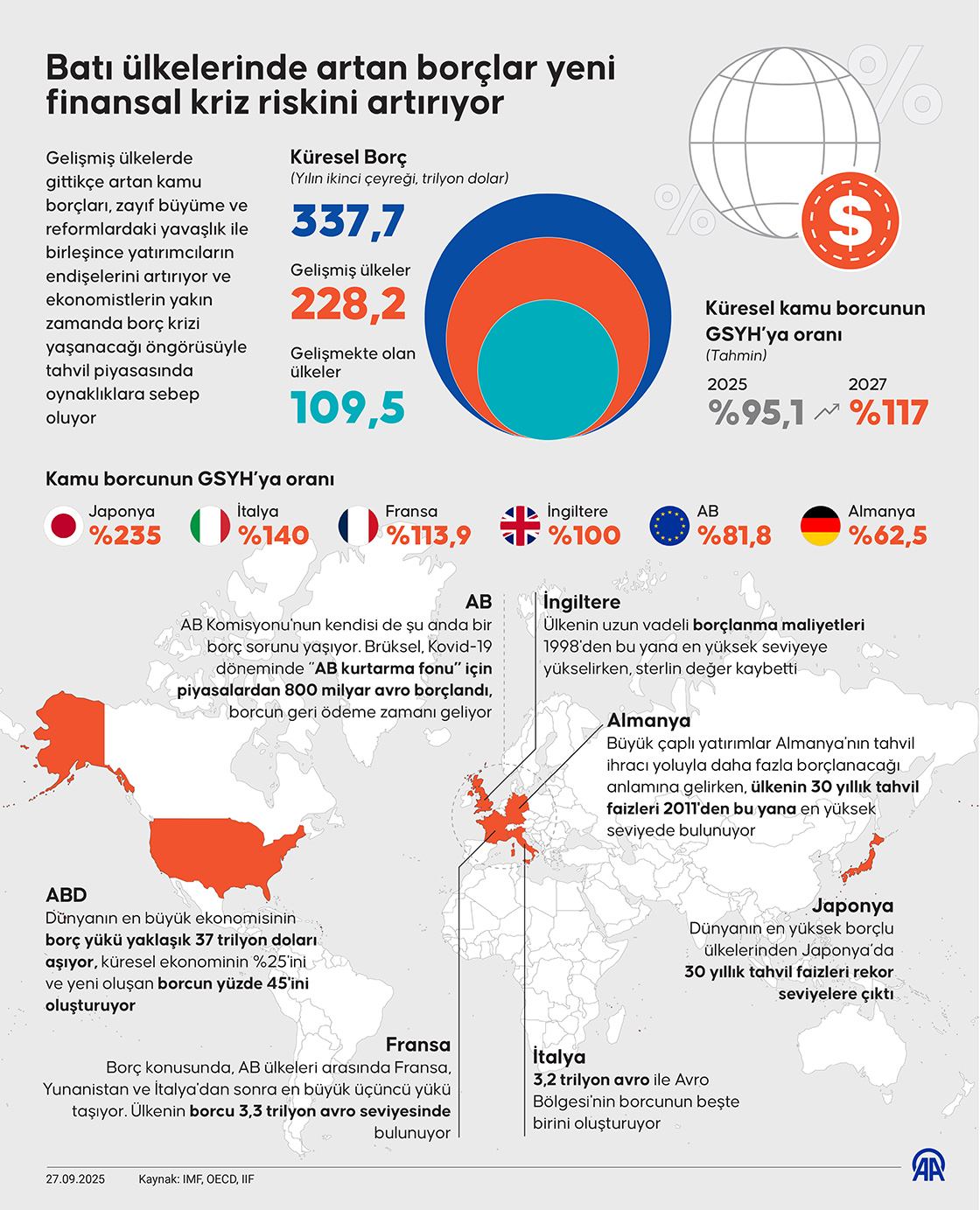 Gelişmiş ülkelerde gittikçe artan kamu borçları, zayıf büyüme ve reformlardaki yavaşlık ile birleşince yatırımcıların endişelerini artırıyor ve ekonomistlerin yakın zamanda borç krizi yaşanacağı öngörüsüyle tahvil piyasasında oynaklıklara sebep oluyor. (Grafik: Murat Usubali/AA)