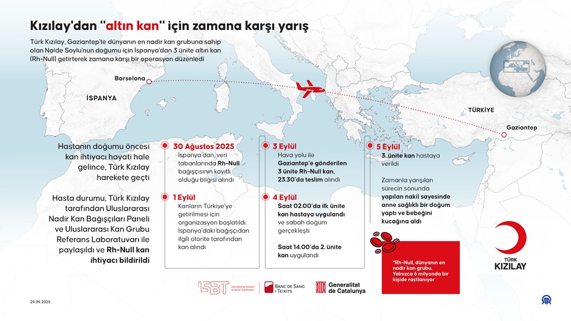 Türk Kızılay, Gaziantep'te dünyanın en nadir kan grubuna sahip olan Naide Soylu'nun doğumu için İspanya'dan 3 ünite altın kan (Rh-Null) getirterek zamana karşı bir operasyon düzenledi. (Grafik: Efnan İpşir/AA)
