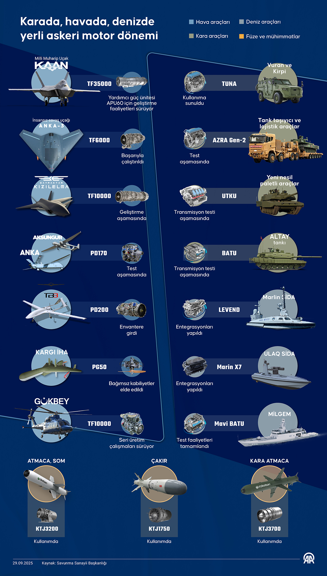 Türk savunma sanayisi, motor teknolojilerinde karşı karşıya kaldığı örtülü ya da açık ambargolara rağmen, "tam bağımsızlık" hedefi doğrultusunda yürüttüğü çalışmalarla kara, hava, deniz ve füze sistemlerinde kritik kabiliyetleri yerli ve milli çözümlerle karşılamaya başladı. ( Mehmet Yaren Bozğun - Anadolu Ajansı )29 Eylül 2025•Güncelleme: 29 Eylül 2025