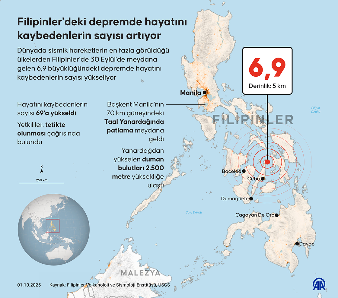 Dünyada sismik hareketlerin en fazla görüldüğü ülkelerden Filipinler’de 30 Eylül'de meydana gelen 6,9 büyüklüğündeki depremde hayatını kaybedenlerin sayısı yükseliyor. (Grafik: Murat Usubali/AA)