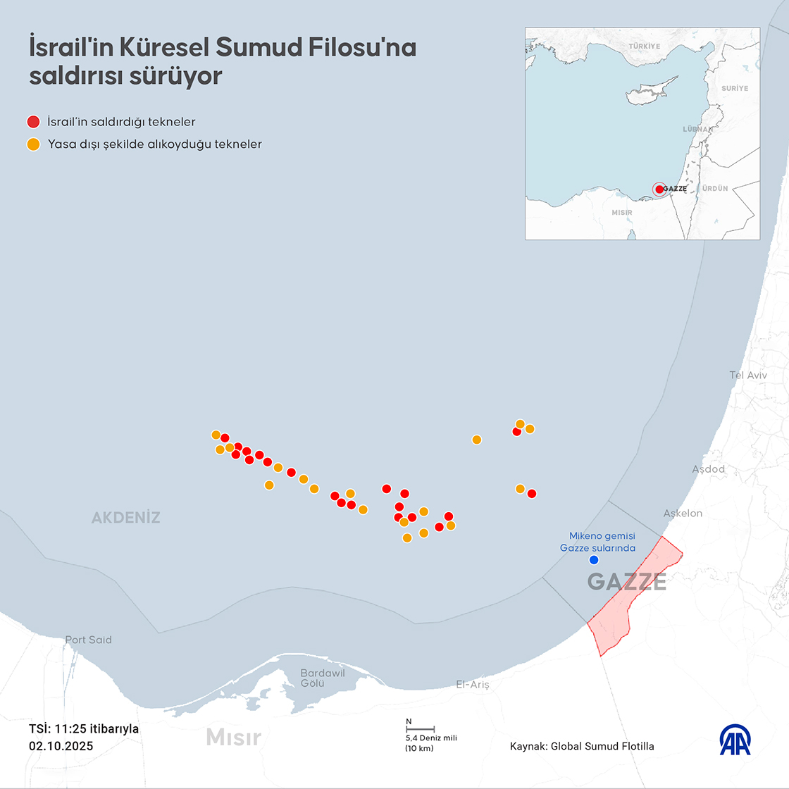 İsrail ablukasını kırmak ve insani yardım ulaştırmak amacıyla Gazze'ye doğru yol alan Küresel Sumud Filosu'nun takip sistemine göre Mikeno gemisi Gazze sularına girdi. (Grafik: Kadri Suat Çelik/AA)